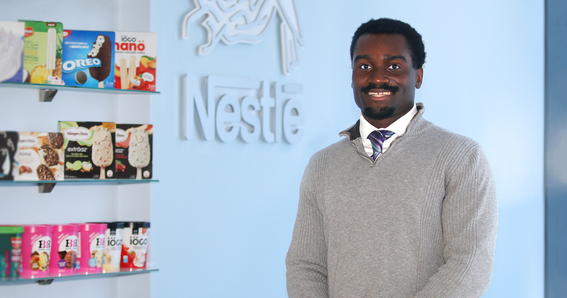 Noah Matsakawo-Fugar in the lobby of Nestle Canada's ice cream factory, beside a shelf displaying various products